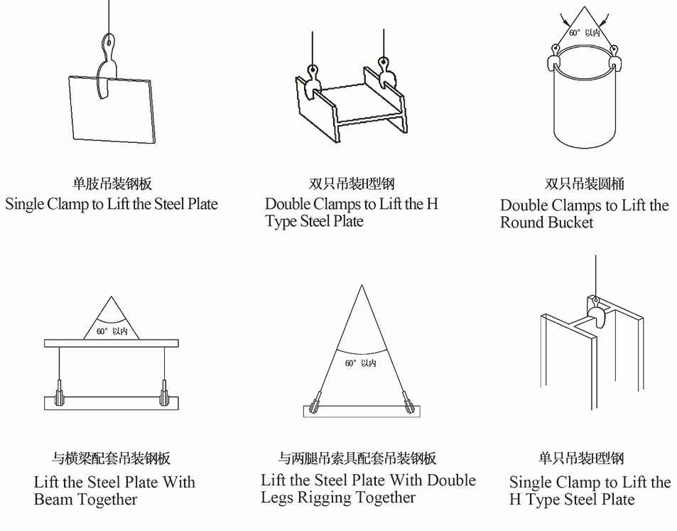1.当双肢索具连接竖钳起吊同一块钢板时,有万向吊环式的顶角不超过60度,无万向吊环式的顶角不超过30度,而且两只吊钳的大起重载荷不得超过单肢的1.5倍。