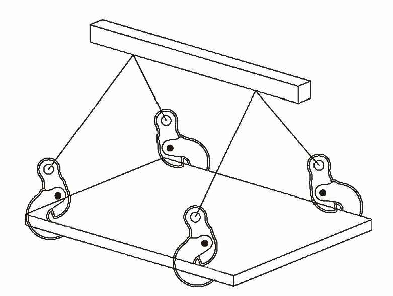 2.当被吊运的钢板较短时,只有横钳采取四腿索具吊装。(如下图只限于横钳)